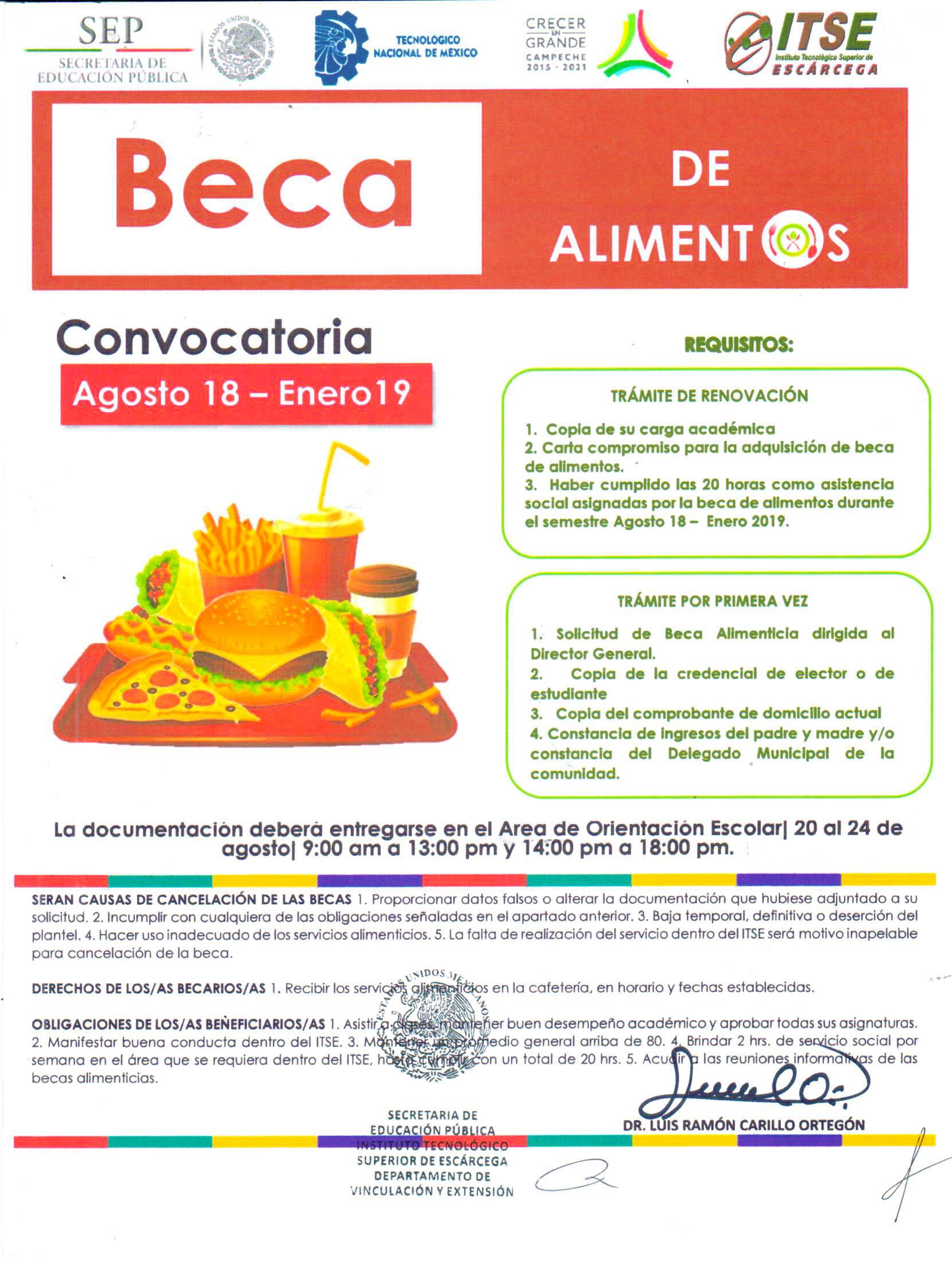 ATENTO AVISO : A toda a la comunidad estudiantil del Instituto Tecnológico Superior de Escárcega que desea tramitar la Beca de Alimentos para renovación o por primera vez, los requisitos son los siguientes.